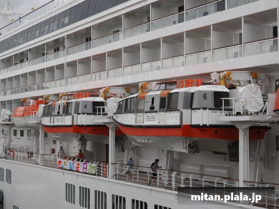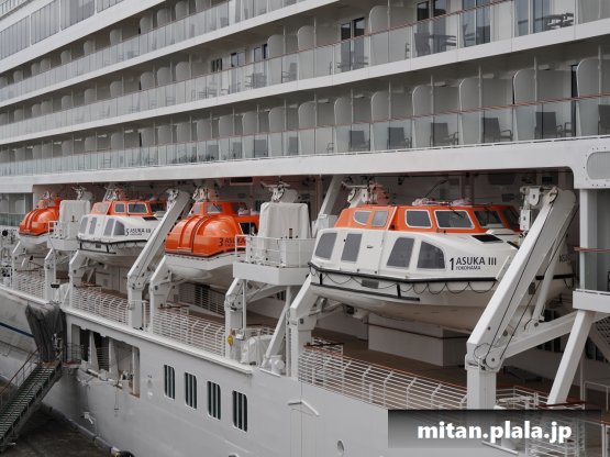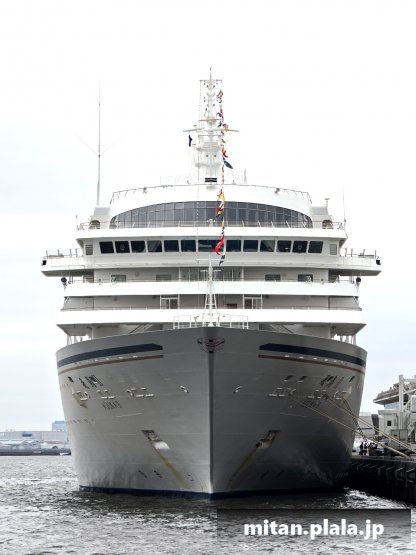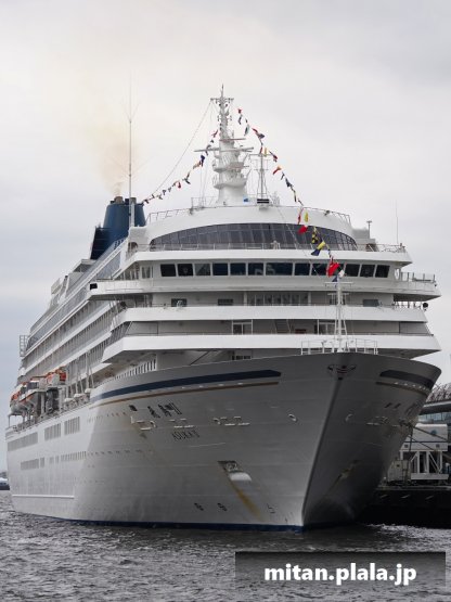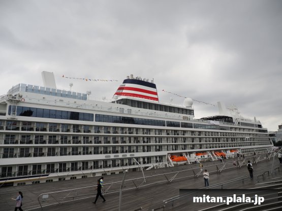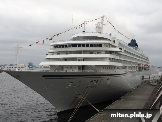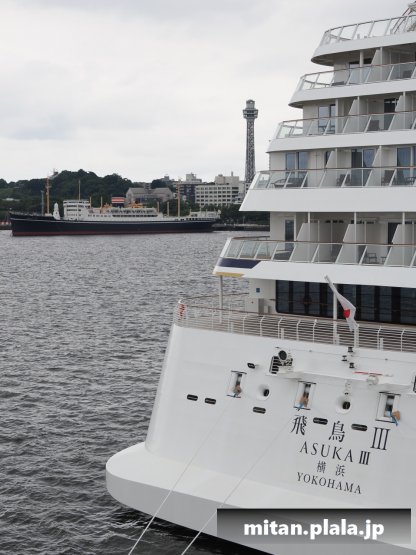 大さん橋に客船が停泊するときは、船の左舷を桟橋につけるのが定石ですが、なぜか、この時は飛鳥IIIは右舷をつけていたので、二つの船が同じ向きというこれもレアな光景が見れました。